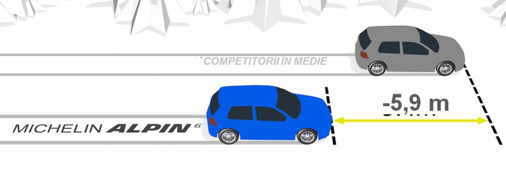 Testele efectuate de TÜV SÜD* au demonstrat că Alpin6 rulată se opreşte cu 5,9 metri mai repede pe zăpadă decât media concurenţilor şi, de asemenea, are o mai bună tracţiune în pantele alunecoase.
