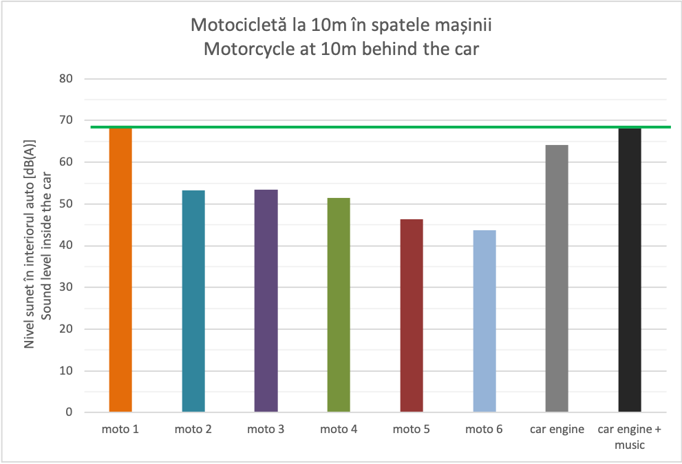 Pentru a simula situații reale, s-a măsurat sunetul în mașină atunci când motocicleta se află la 15m și la 10m în spatele mașinii, dar și când este în unghiul mort al șoferului sau când motocicleta este în fața mașinii. De asemenea, a fost analizată distribuția sunetului emis de motocicletă în față și în spate la diverse turații pentru a măsura influența turației asupra zgomotului și asupra modului în care acesta se distribuie în fața și în spatele motocicletei.
