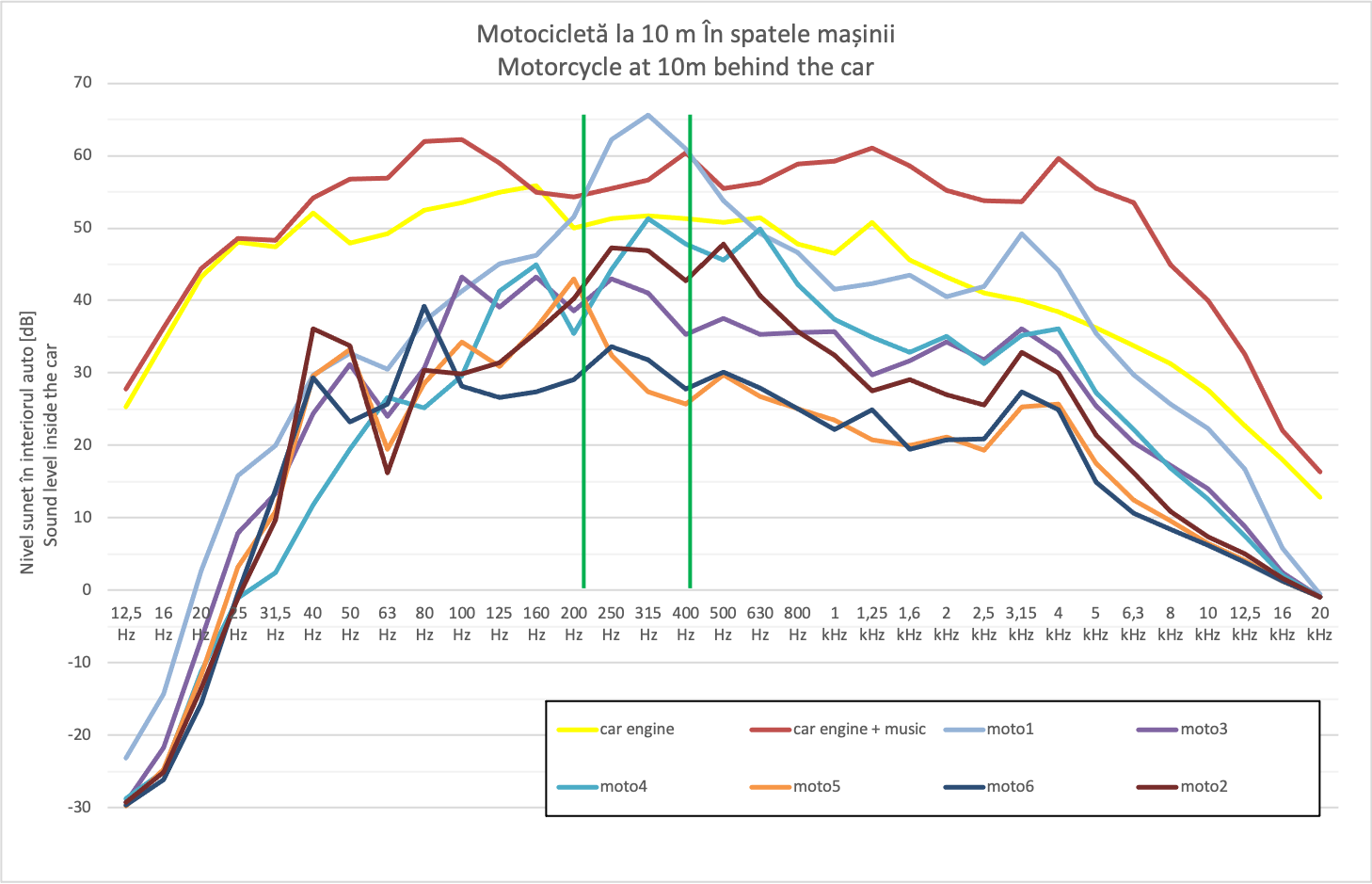 Rezultatele testului sunt clare: o motocicletă nu se aude în mașină (aflată în mers) dacă este la o distanță mai mare de 15m, indiferent de modificarea tobei și indiferent de zgomotul de fond din habitaclu.
