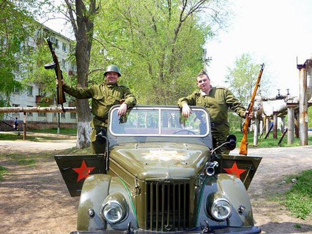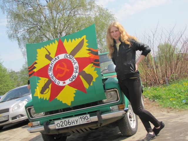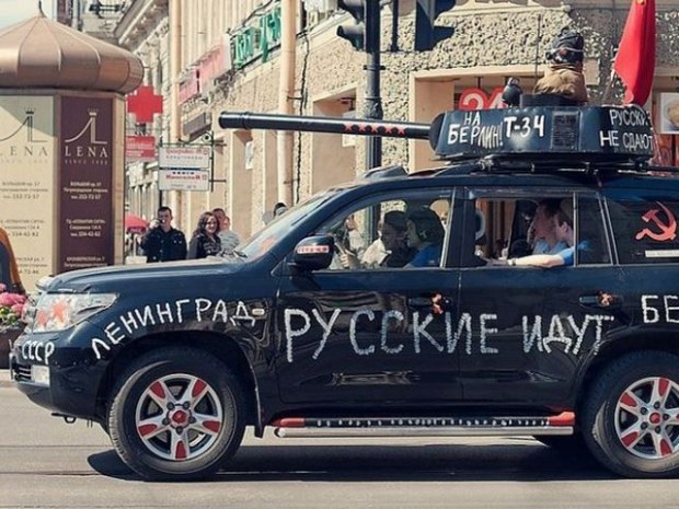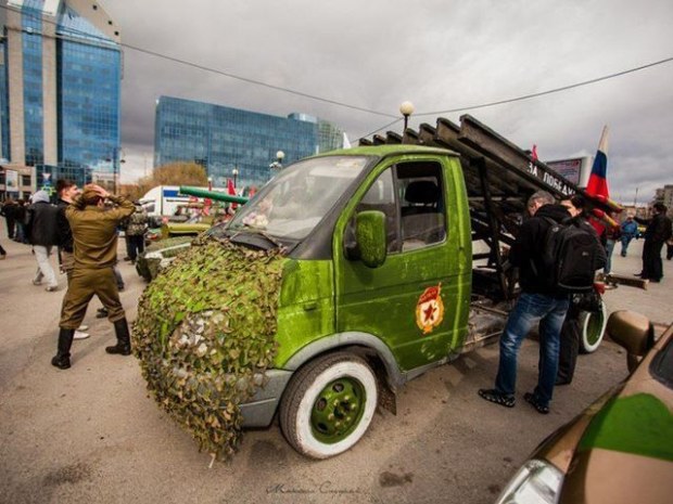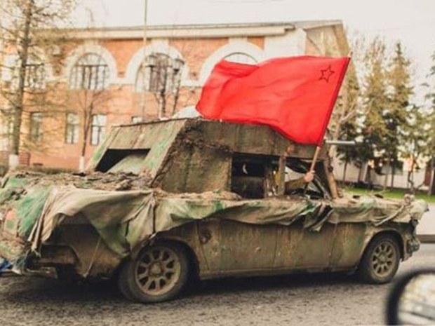 Ei bine, veţi spune, şi care e legătura cu maşinile?! Păi iată că există o legătură chiar strânsă, deoarece ideea de zi a victoriei s-a viralizat printre ruşi, aceştia demonstrându-şi patriotismul într-un mod inedit: îşi transformă maşinile în ”arătări” care amintesc de război, transformându-le metaforic (şi cu ajutorul cartonului şi vopselei) în tancuri, lansatoare de katiuşe sau alte utilaje de război.