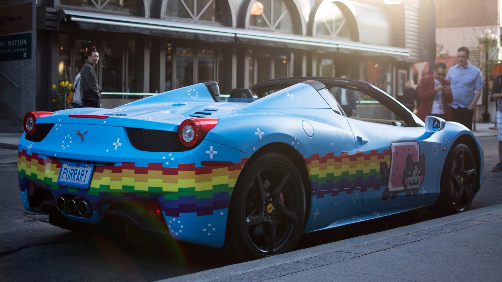 Povestea, succint, sună cam aşa: producătorul canadian de muzică house cunoscut sub pseudonimul Deadmau5 şi-a cumpărat un Ferrari 458 Italia Spider şi l-a personalizat cu tema Nyan Cat (dacă nu ştii ce e aia, dă click aici pentru 10 ore de transă). Ferrari-ul lui Deadmau5, botezat Purrari, a devenit suficient de cunoscut încât vestea existenţei lui să ajungă la urechile avocaţilor Ferrari, care i-au cerut frumos să scape de tema aia grafică de pe maşină.