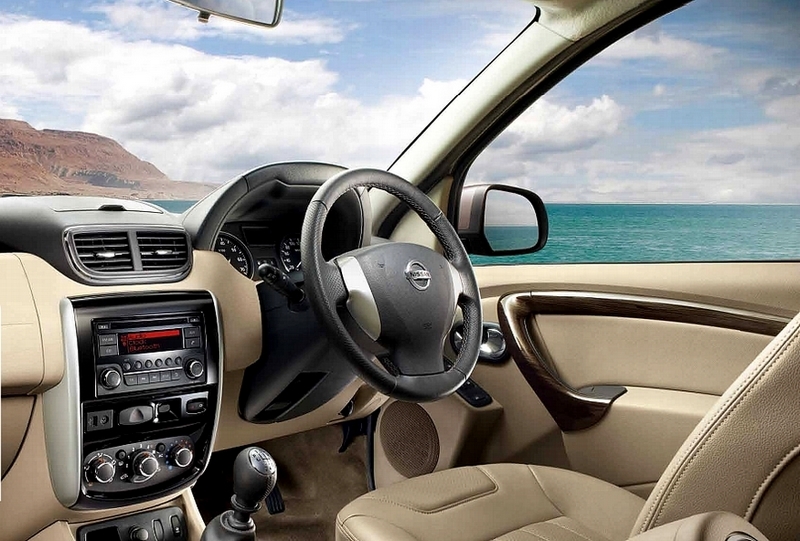 Şi în interior lucrurile stau altfel, ba chiar am putea spune mult mai diferit decât în cazul exteriorului. Planşa de bord este altfel desenată, de la tabloul cu doar două indicatoare (faţă de trei la Duster) până la aeratoarele centrale diferite şi instalaţia multimedia specifică. Pe piaţa indiană, Terrano e oferit cu 5 niveluri de echipare şi o paletă largă de ornamente şi tapiţerii.