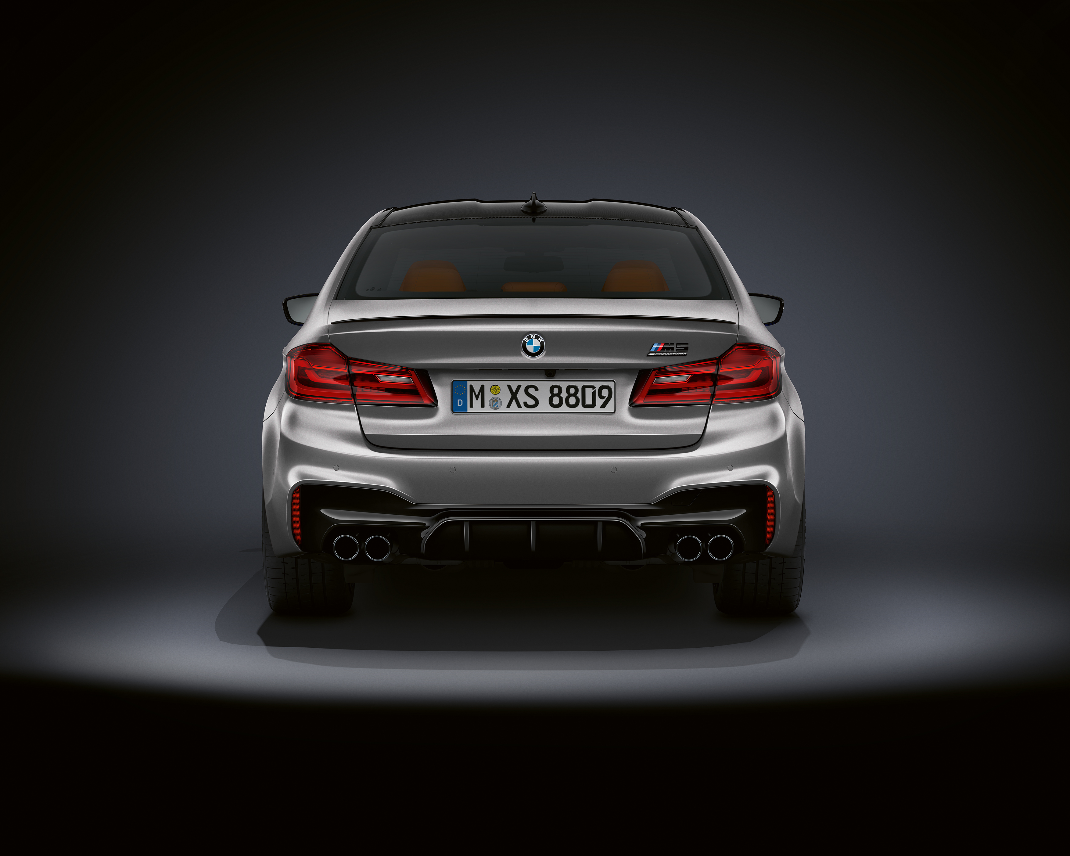 Sentimentul de exclusivitate al noului BMW M5 Competition este îmbunătăţit suplimentar de o serie de caracteristici de design specifice modelului. Echiparea BMW Individual Shadow Line high-gloss este completată de utilizarea unui negru lucios – sportiv şi discret – pentru conturul grilei radiatorului, plasa decorativă a branhiilor BMW M de pe aripile faţă, ornamentele pentru acoperirea barei spate şi capacele oglinzii exterioare. O altă caracteristică specială o reprezintă mânerele uşilor, care sunt vopsite complet în culoarea caroseriei. Spoilerul spate şi emblema „M5” de pe capota portbagajului – care poartă şi inscripţia „Competition” – sunt şi ele de culoare negru lucios.
