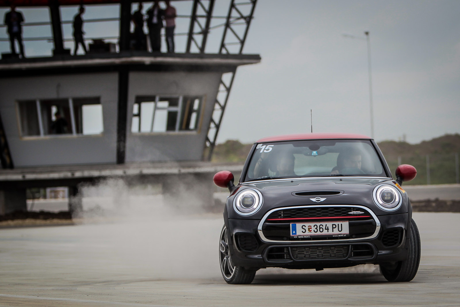 Organizatorii au pus la cale trei exerciţii – unul de taxi drive, în care am stat pe scaunul pasagerului din dreapta, iar un instructor (vecin de-al nostru, din Bulgaria) şi-a făcut de cap cu drifturi pe o suprafaţă cu aderenţă scăzută, unul de slalom pe suprafeţe cu niveluri diferite de aderenţă şi unul pe circuit, unde am putut gusta puţin de distracţia pe care o poate oferi un Mini John Cooper Works.