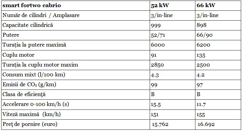 Începând cu luna martie noul smart fortwo cabrio va fi disponibil în România, la Autoklass Pipera – Centru Autorizat de Vânzări şi Service smart. La lansare vor fi disponibile două variante de motorizare cuplate la transmisia automată twinamic, urmând ca variantele cu transmisie manuală să fie lansate în perioada următoare.