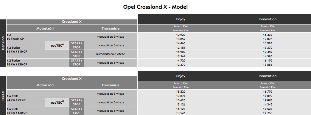 Noul SUV Opel, Crossland X, va fi disponibil în toate centrele Opel din ţară începând cu data de 10 iulie. Versiunea de bază a unităţii pe benzină este motorul de 1,2 litri cu putere de 81 cp, apoi urmează motorul turbo de 1,2 l cu injecţie directă de benzină şi trei variante de transmisie diferite.