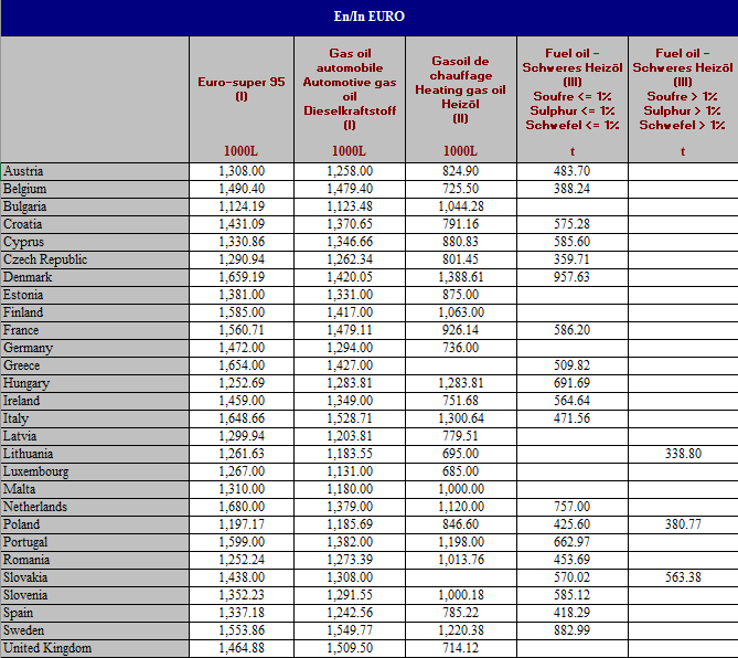 În ceea ce priveşte motorina, situaţia este alta. România depăşeşte mai multe state din Europa când vine vorba de preţ/litru. Austria (1.25 euro), Bulgaria (1.12 euro), Cehia (1.26 euro), Letonia (1.20 euro), Lituania (1.18 euro), Luxemburg (1.13 euro), Malta (1.18 euro), Polonia (1.18 euro) şi Spania (1.24 euro) au preţul la pompă mai mic decât în România. Preţul mediu în Europa este peste cel din România, fie că ne referim la zona Euro (1.37 euro), fie la UE (1.37 euro).