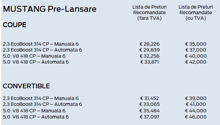 Iată mai jos lista completă de preţuri pentru noul Mustang în România: