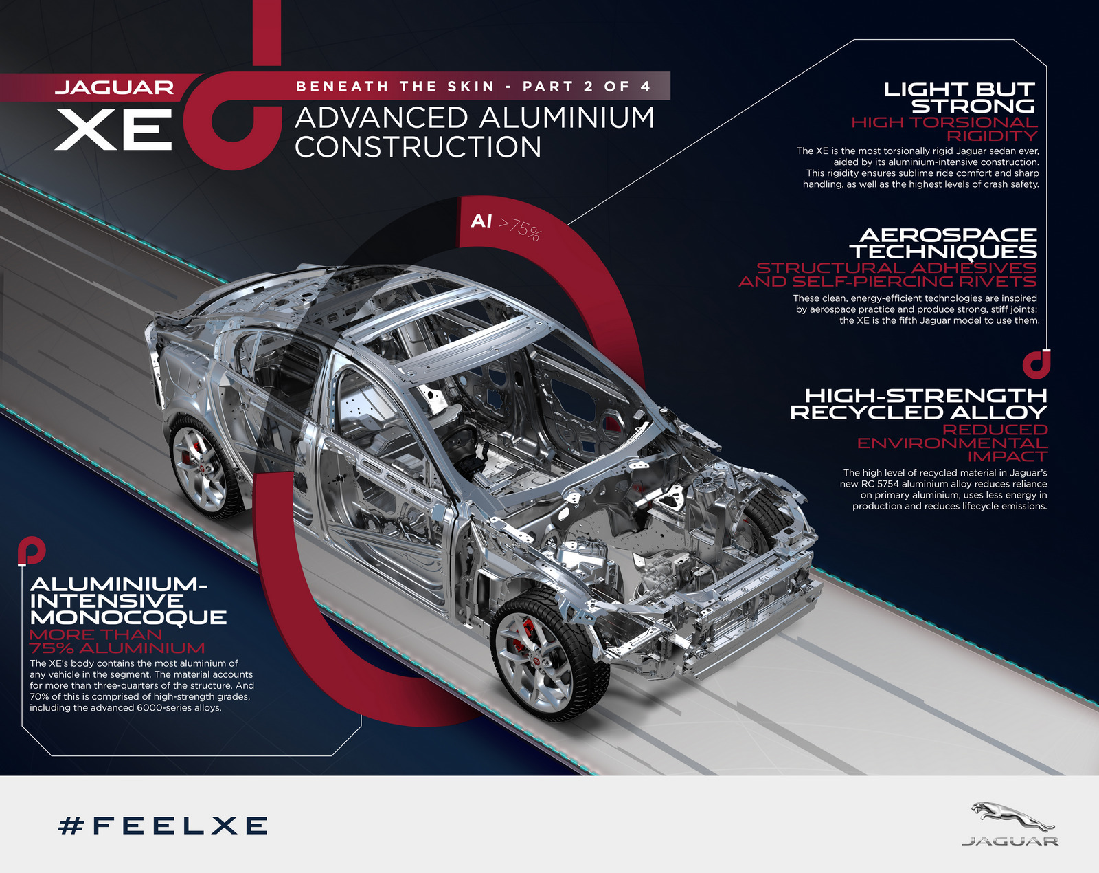 Conform oficialilor mărcii, noul XE va avea o structură construită preponderent din aluminiu, iar gama de motorizări va pleca de la unităţi care au emisii de dioxid de carbon mai mici de 100 g/km şi va ajunge la propulsoare care pot oferi viteze maxime de peste 300 km/h.