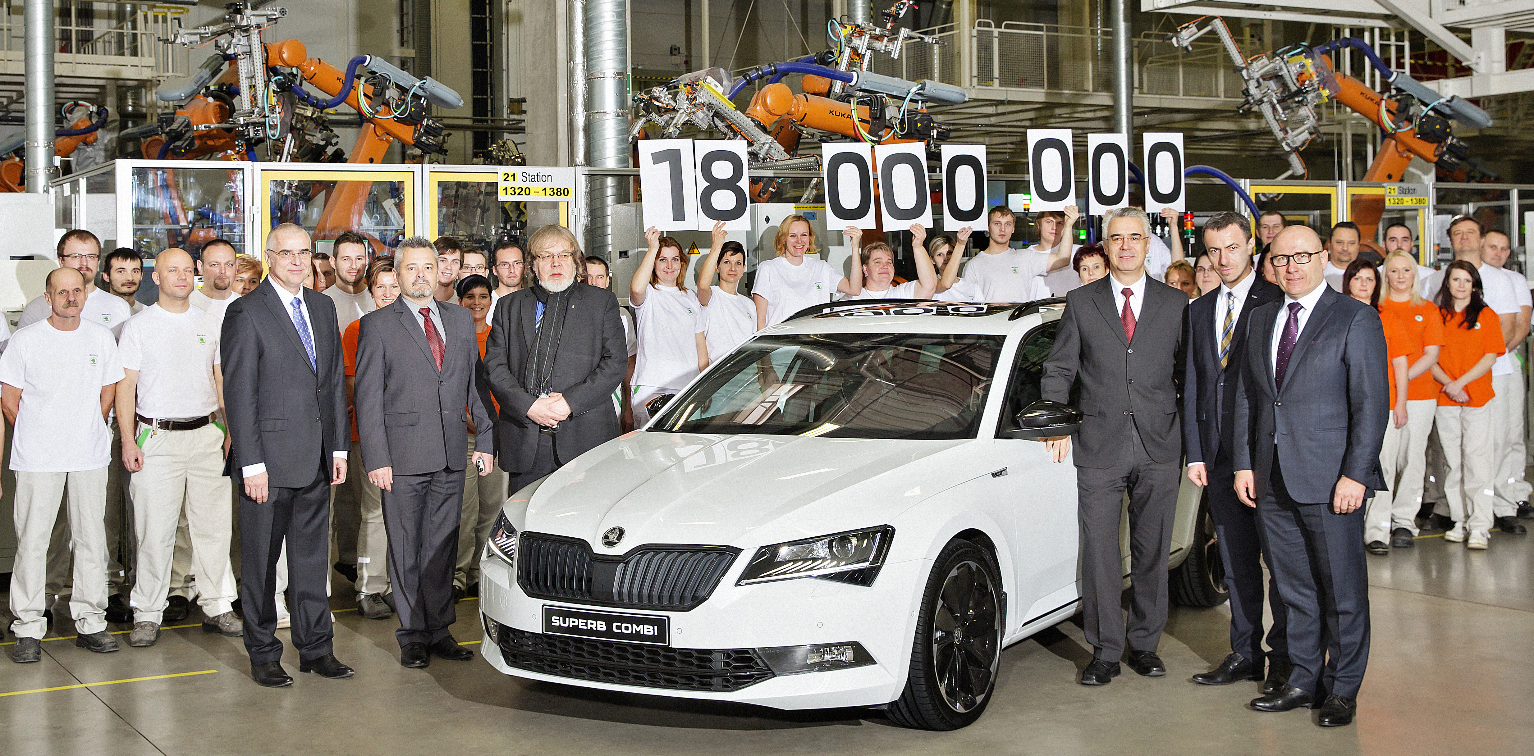 Autovehiculul Skoda cu numărul 18.000.000 a ieşit pe poarta fabricii constructorului din Kvasiny pe 19 ianuarie 2016. Modelul aniversar este o Skoda Superb Combi în nuanţa Alb Candy.