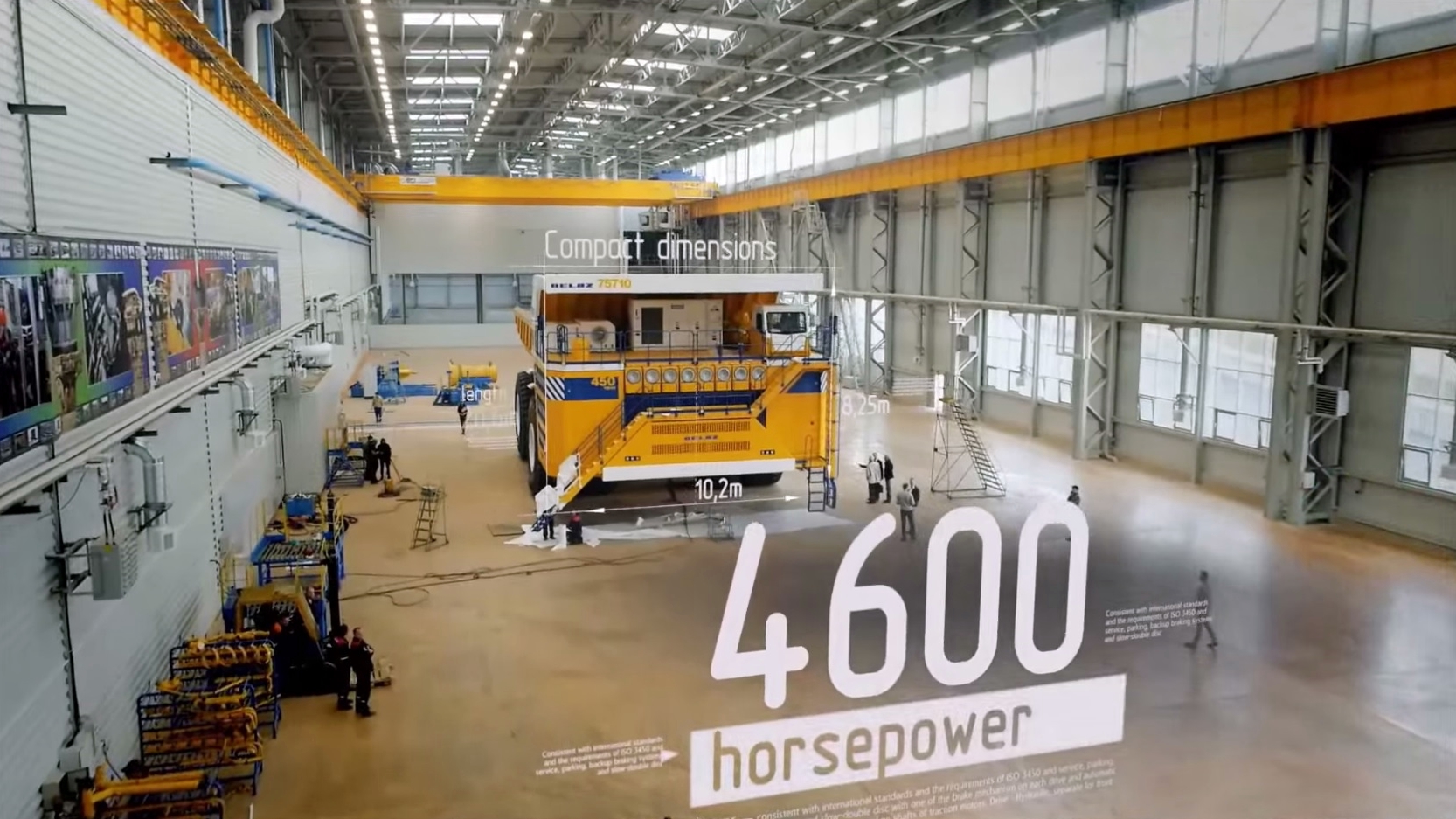 Aşadar, este cea mai mare maşinărie electrică din lume. Şi când spunem mare, ne referim la 810-tone-mare. Are 20,6 metri lungime, 9,8 metri lăţime şi 8,1 metri înălţime. Sistemul de propulsie electric îi conferă tracţiune integrală şi o viteză maximă de 64 de kilometri la oră „la gol”. Iar când este pus la treabă, Belaz 75710 poate căra până la 450 de tone.
