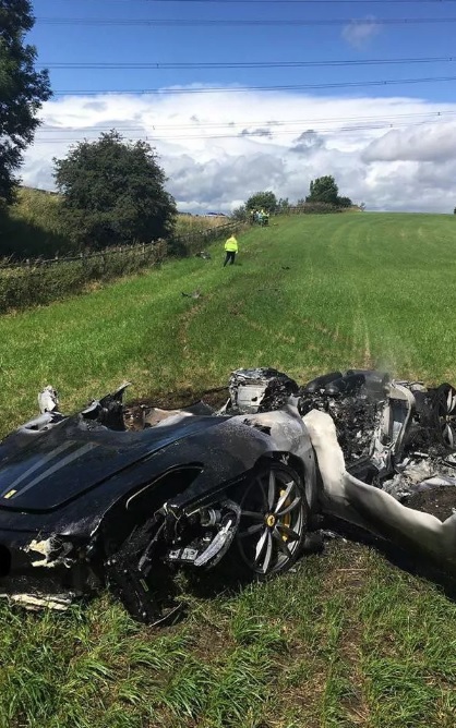 Şoferul abia îşi cumpărase acest Ferrari 430 Scuderia, şi după doar o oră de la plecarea din showoom, a ieşit cu maşina de pe carosabil, a ajuns cu ea în câmp, unde a luat foc.