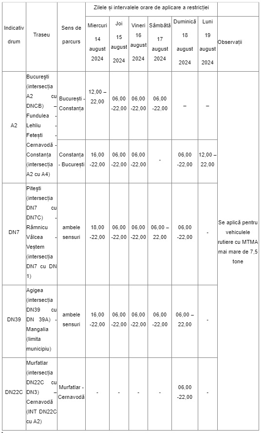 CNAIR anunță participanții la trafic că potrivit prevederilor Ordinului MT-MAI nr. 1249-132/2018, circulația vehiculelor rutiere cu masa totală maximă autorizată mai mare de 7,5 tone, altele decât cele destinate exclusiv transportului de persoane, este interzisă în zilele de miercuri 14 august (data premergătoare zilei de sărbătoare legală), joi 15 august (ziua Adormirea Maicii Domnului), vineri 16 august (zi liberă conform HG nr. 1307/2023), sâmbătă 17 august 2024 și duminică 18 august 2024 conform Anexei nr. 1 la Ordin.