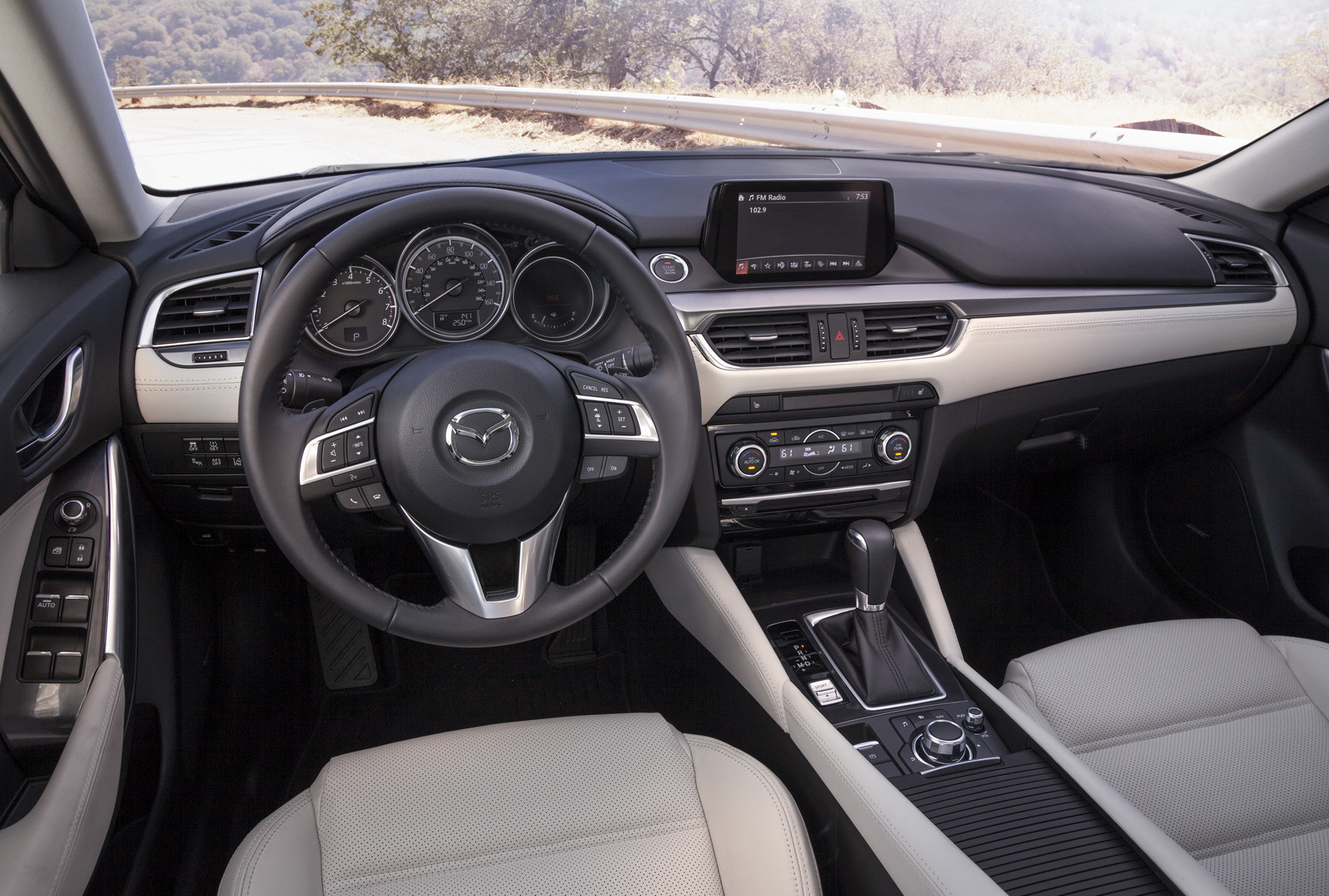La interior, Mazda6 a adoptat dispunerea elementelor în stilul rivalilor premium, cu ecranul „anexat” bordului. Acesta rulează acum noul sistem de conectivitate Mazda Connect. Levierul frânei de mână a dispărut, fiind înlocuit cu o clapetă din plastic – Mazda6 este primul model al producătorului nipon care să adopte frâna de mână electronică. La capitolul antifonare modelul primeşte, de asemenea, îmbunătăţiri, promiţând acum călătorii mai confortabile ca niciodată.