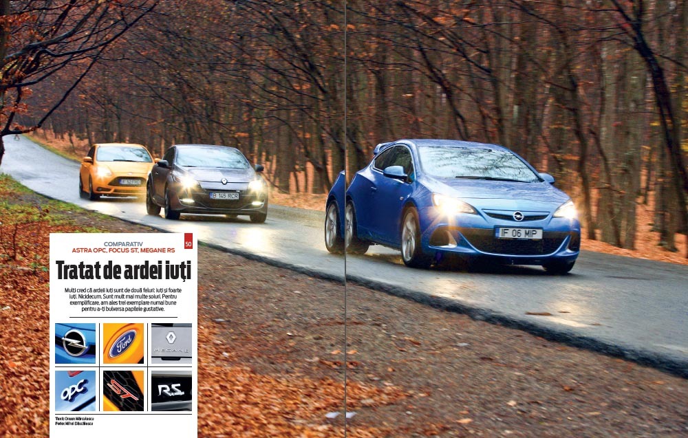 Gastronomia ar fi fadă fără condimente. De aceea ne-am gândit să facem un fel de master-chef cu Opel Astra OPC, Ford Focus ST şi Renault Megane RS. Ce a ieşit, vedeţi în revistă!