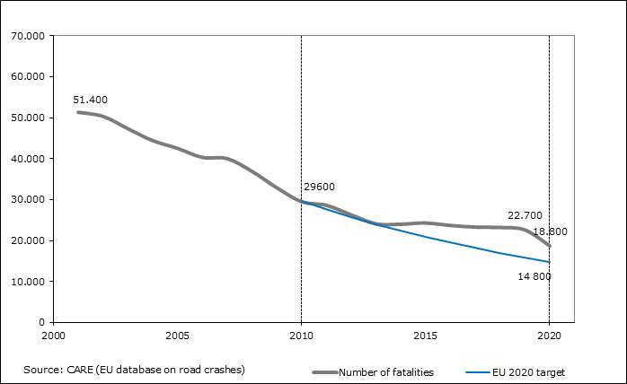 Media Uniunii Europene este de 42 de decese la un milion de locuitori, ceea ce reprezintă o scădere cu 17% față de 2019 și cu 36% în ultimii 10 ani (din 2010). Și la nivel european, restricțiile de circulație au dus la scăderi ale mortalității, readucând mai aproape de ținta asumată graficul mortalității. Cu toate acestea, Europa rămâne departe de ținta asumată (cel mult 14.800 de decese în 2020), numărul total fiind cu 4.000 mai mare.