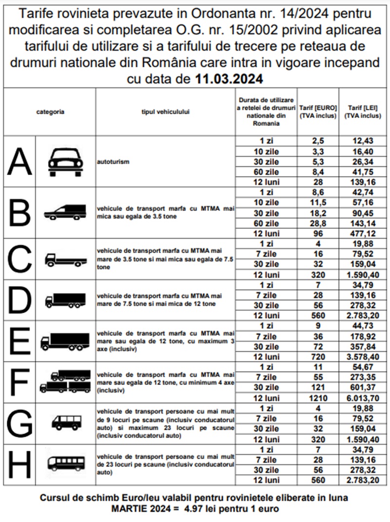 Noile tarife pentru rovinietă au fost publicate de Compania Națională de Drumuri. Din 11 martie 2024, cea mai ieftină rovinietă costă 2.5 euro. Aceasta este destinată autoturismelor și are o valabilitate de 24 de ore.