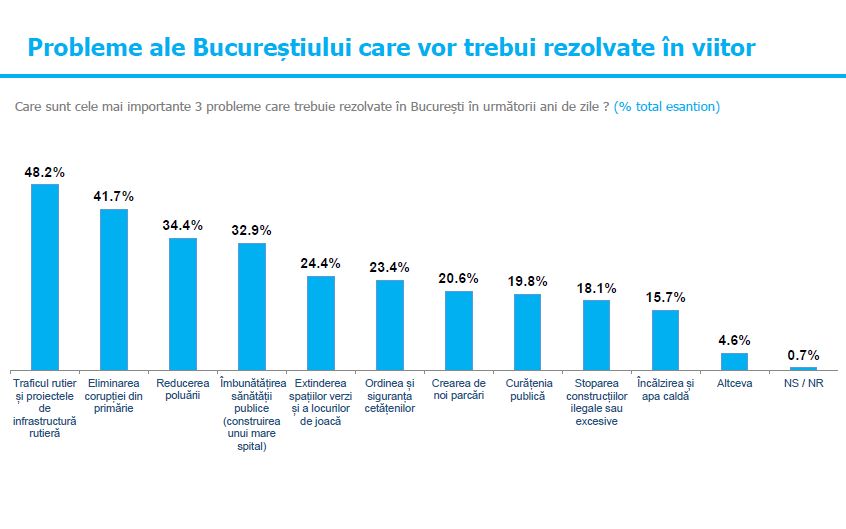 Deloc întâmplător, după identificarea problemelor, cele mai arzătoare dintre acestea, care trebuie rezolvate cât mai rapid, sunt tot traficul rutier și infrastructura rutieră (48,1% dintre cei chestionați dorind rezolvarea cu prioritate a acestor probleme). Pe locul 3 a fost indicată reducerea poluării (34,5%), iar pe 7, crearea de noi parcări (20,6%). Este interesant că cei care doresc rezolvarea cu prioritate a unor anumite probleme sunt ceva mai puțini decât cei care au indicat că sunt deranjați de aceste probleme.