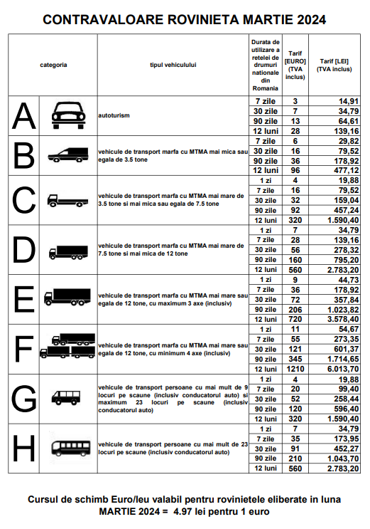 Pe site-ul Companiei Naționale de Drumuri (CNAIR) este publicat tabelul cu prețurile pentru rovinietă, valabile în prezent.