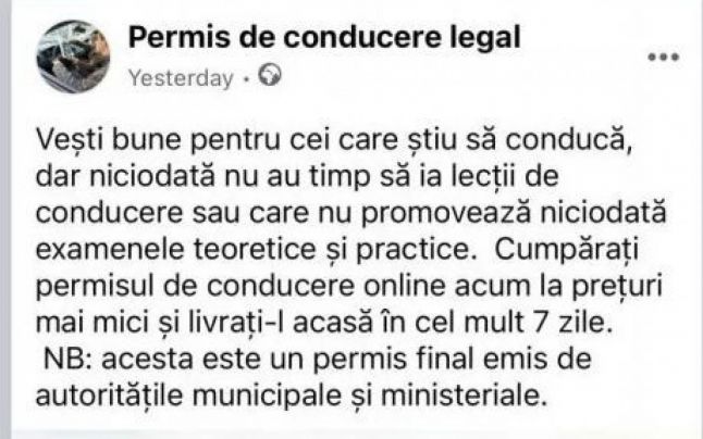 “Vești bune pentru cei care știu să conducă, dar niciodată nu au timp să ia lecții de conducere sau care nu promovează niciodată examenele teoretice şi practice. Cumpărați permisul de conducere online acum la prețuri mai mici și livrați-l acasă în cel mult 7 zile. NB: acesta este un permis final emis de autoritățile municipale și ministeriale”, este unul din mesajele postate pe rețeaua de socializare de tânărul din Vaslui.