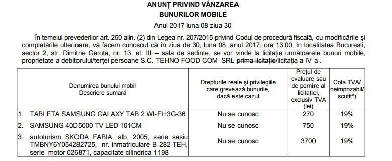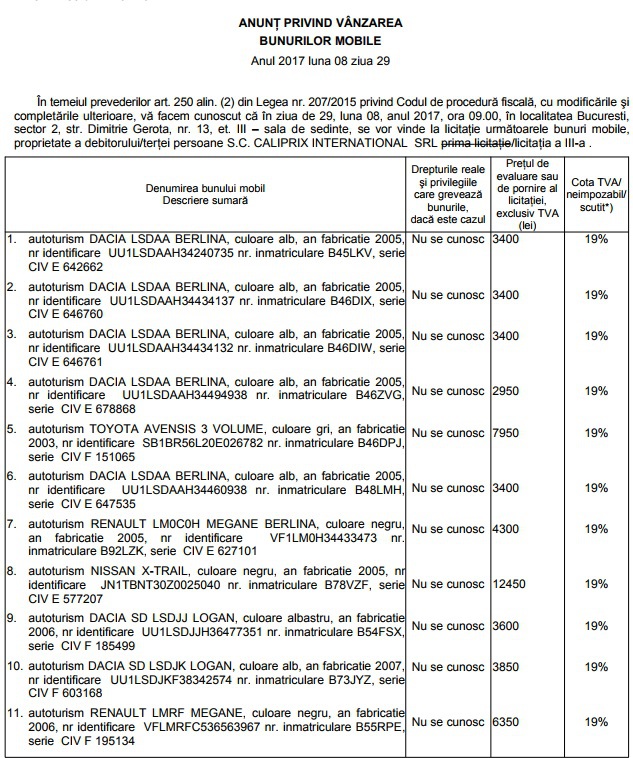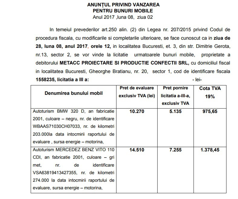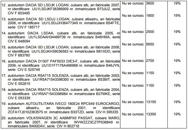 Preţurile de pornire variază între 1200 de lei şi 17.000 de lei şi includ TVA. Licitaţiile sunt programate în intervalul 30 august – 6 septembrie la sediul ANAF din localitatea Bucuresti, et. 3, din str. Dimitrie Gerota, nr.13, sector 2.