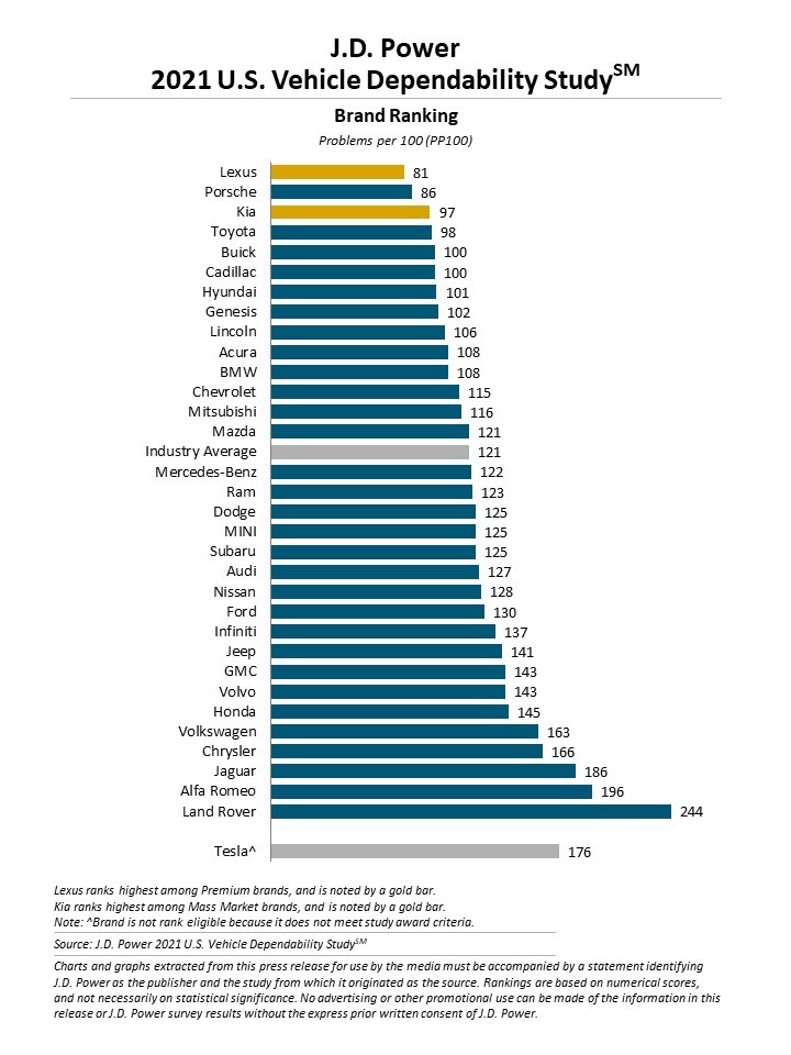 Având în vedere că, în general, americanii au condus mai puțin mașinile în ultimele 12 luni, nu este de mirare că rezultatele par mai bune decât anul trecut. Media națională este în 2021 de 121 PP100, cea mai scăzută din istoria JD Power. Cele mai apreciate mașini au fost cele produse de Lexus, cu 81 PP100, marca japoneză câștigând acest clasament în nou ani din ultimii 10. Porsche a ocupat poziția secundă cu 97 PP100, fiind urmată de Toyota (98 PP100) și Buick (100 PP100). Kia devine astfel cel mai apreciat brand non-premium, cu o îmbunătățire a scorului de 35 PP100 față de anul trecut.