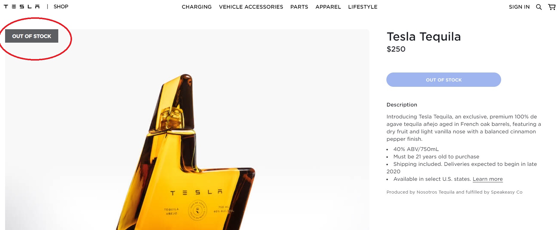 Este vorba de Tesla Tequila, care are o sticlă în formă de fulger. Acesta este printre cele mai accesibile produse din shop-ul Tesla. Sticla poate fi cumpărată cu o sumă de 250 de dolari, dar, din păcate, nu poate fi achiziționată de clienții din România.