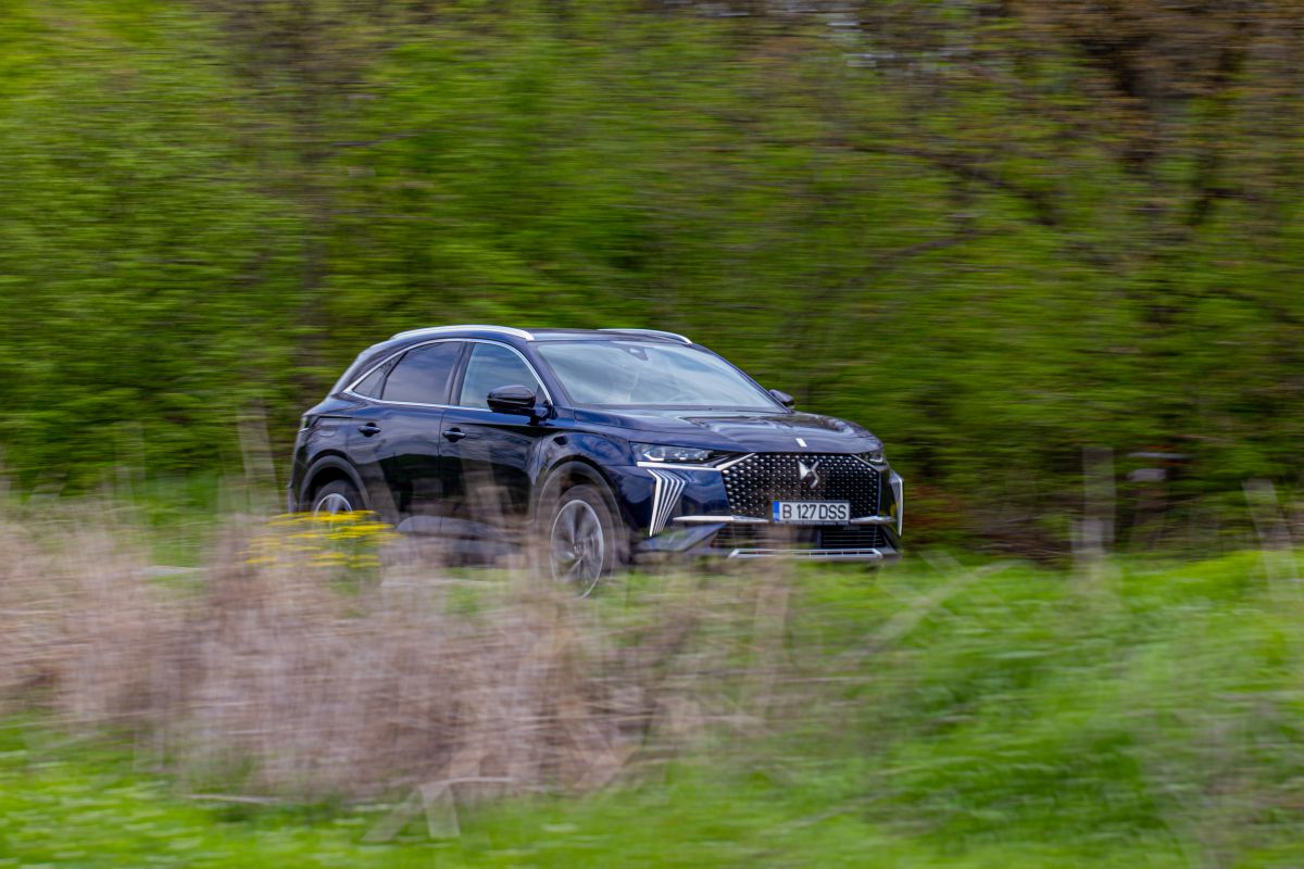 DS 7 nu este un SUV cu pretenții sportive: direcția este moale, ușor de manevrat, iar amortizoarele controlate electronic sunt ajutate de o cameră care scanează drumul, ajustând fermitatea lor după caz. Dacă trecem mașina în sport, lucrurile capătă o notă ușor diferită. Mașina nu mai glisează la fel de fin peste denivelări, direcția se întărește, iar răspunsul pedalei de accelerație este mult mai prompt.