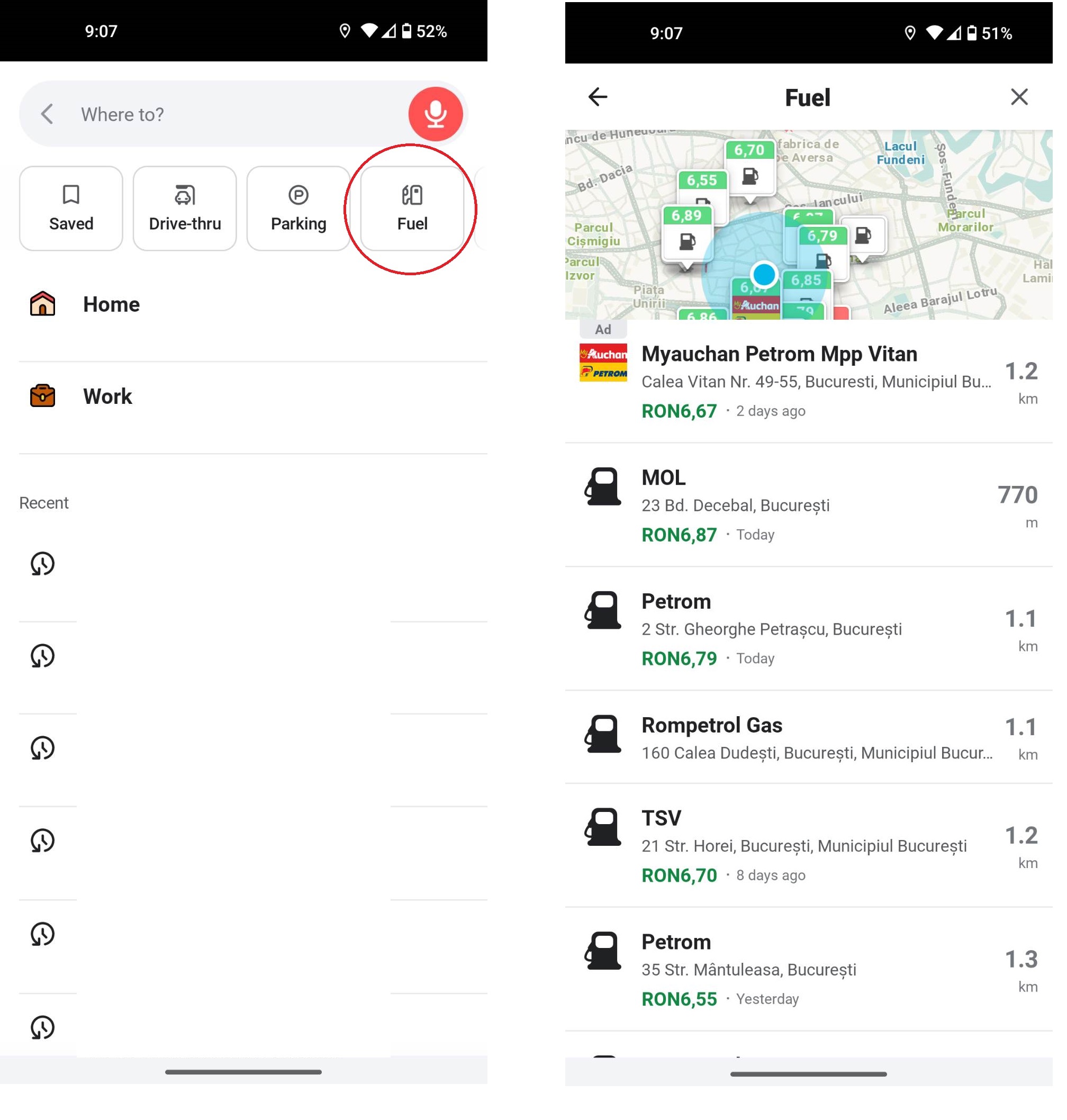 Pur și simplu apăsați pe bara de căutare din partea de jos a ecranului, atingeți Benzinării și veți primi o listă cu benzinăriile din apropiere, cu adrese, distanța și, în mod esențial, prețul benzinei.