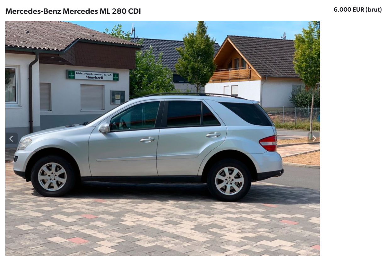 Ultimul, dar nu cel din urmă, este Mercedes-Benz ML. Ml-ul a fost al doilea SUV din gama celor de la Mercedes, după faimosul G. Exemplarul pe care noi l-am găsit este din a doua generație și este fabricat în 2007. Sub capotă are un motor V6 diesel de 3,0 litri, care dezvoltă 190 de cai putere. Motorul este cuplat la o cutie automată cu șapte trepte. Mașina are la bord 316.000 de kilometri și costă 6.000 de euro.