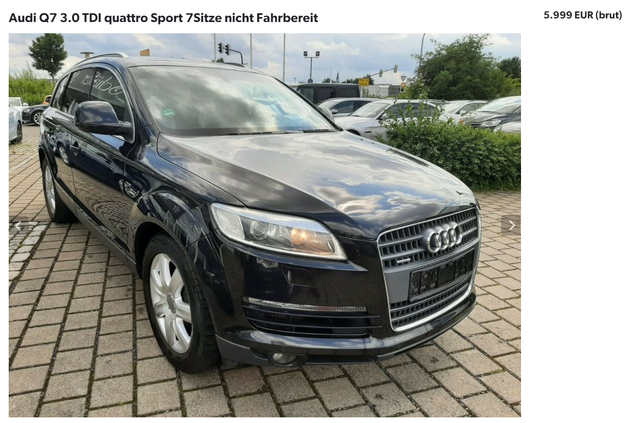 Următorul loc în listă este ocupat de Audi Q7. Din punct de vedere dimensiuni este cel mai mare de pe această listă. De altfel, este singurul care vine cu șapte locuri dintre cele șapte mașini. Sub capotă are un motor de 3,0 litri pe motorină, care are o putere de 232 de cai. Motorul este legat la o cutie automată cu șase trepte. Mașina este din 2006, a parcurs 355.000 de kilometri și costă 5.999 de euro.