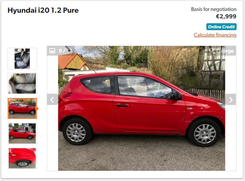 Un Hyundai i20, înmatriculat în anul 2011, rulaj 156.000 km, motor benzină și cutie de viteze manuală poate fi cumpărat cu mai puțin de 3.000 de euro. Acest exemplar pare că a trecut printr-un mic incident rutier. În urma lui s-a ales cu zgârieturi pe partea dreaptă, așa că ar fi loc de negociere.