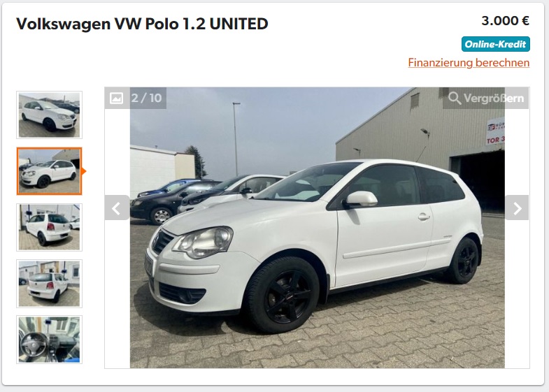 Cumpărat de nou, Volkswagen Polo costă mai mult decât mulți dintre rivalii săi, iar motivul ar fi că primești mai mult. Este confortabil, are o rulare suplă și un interior bine finisat, care imită modelul fratelui mai mare Golf. Motoarele mici, turbo pe benzină, sunt cele mai bune alegeri, deoarece tind să fie mai line și mai silențioase decât cele diesel. Un asemenea exemplar am găsit și noi pe Mobile.de. A fost înmatriculat în anul 2008 și a ajuns în prezent la un rulaj de 156.000 de km. Motorul de 1.2 litri produce 51 kW (69 CP).