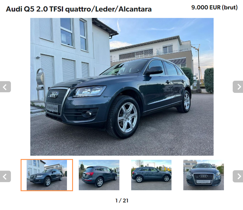Următoarea mașină vine tot din Germania, dar de la Audi. Q5 este SUV-ul mijlociu din gama Audi și vine cu o arhitectură premium, ceea ce înseamnă care are motoare montate longitudinal. Mașina pe care am ales-o dispune de un motor de 2,o litri pe benzină, care produce 211 cai putere. Are cutie automată și transmisie integrală. Este un exemplar din anul 2009 și are la bord 163.000 de kilometri, dar încă se păstrează bine. Exteriorul arată bine, iar interiorul finisat cu piele și alcantara se află în stare bună. Prețul cu care se vinde această mașină este de 9.000 de euro.