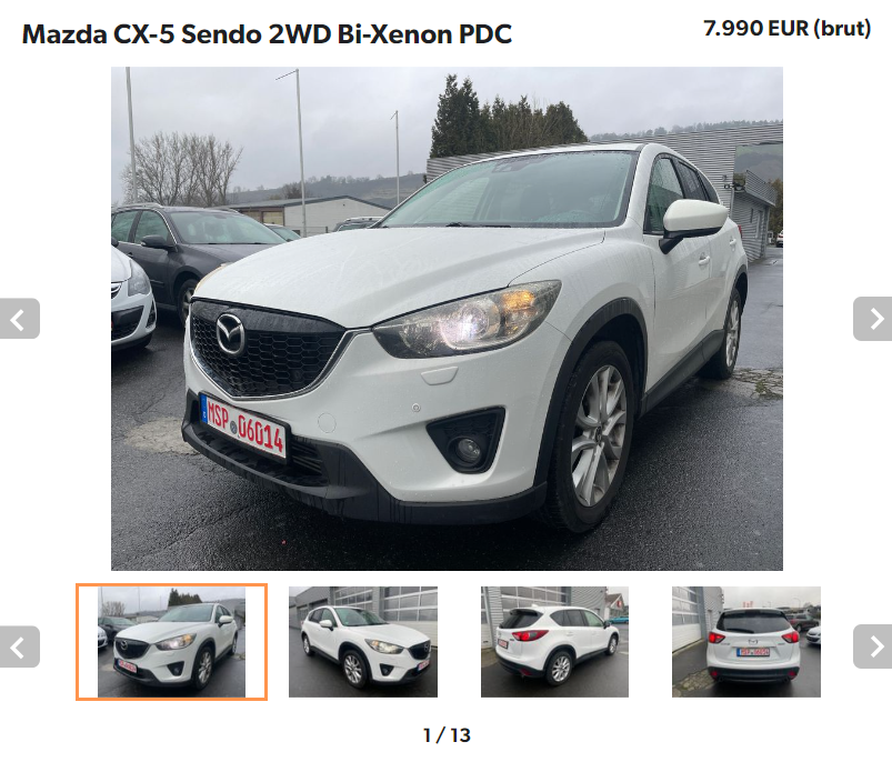 Ne mutăm atenția acum și către un model japonez, anume Mazda CX-5, un model îndrăgit în toată lumea. Mașina aleasă de noi este fabricată în anul 2015 și are la bord 210.090 de kilometri. Motorul este unul pe motorină, cu o capacitate de 2,2 litri și care dezvoltă 150 de cai putere. Cutia de viteze este una manuală, iar mașina de față nu are tracțiune integrală. În schimb, are faruri cu xenon și sistem de navigație. Prețul care se vinde această Mazda CX-5 este de 7.990 de euro.