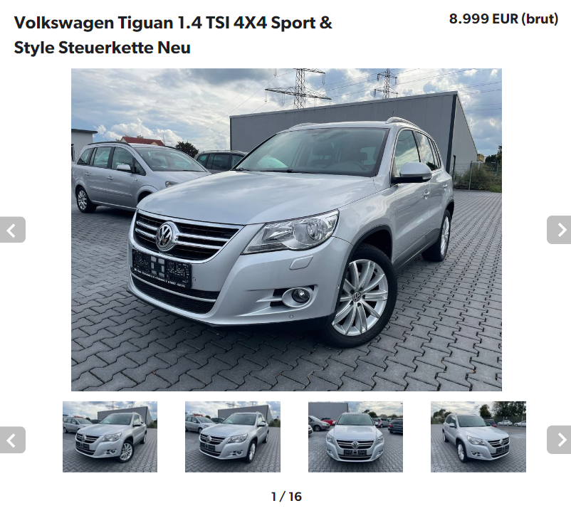 Un alt bestseller este Volkswagen Tiguan, un SUV compact care împarte platforma cu multe alte produse ale Grupului Volkswagen. Acest lucru favorizează accesul al o gamă largă de piese și o mentenanță ușoară. Cel pe care l-am ales este din anul 2009 și are un motor de 1,4 litri pe benzină, care produce 150 de cai. Cutia de viteze este una manuală, iar mașina are și tracțiune integrală. Acest Tiguan are la bord doar 104.000 de kilometri, iar prețul cerut este 8.999 de euro.