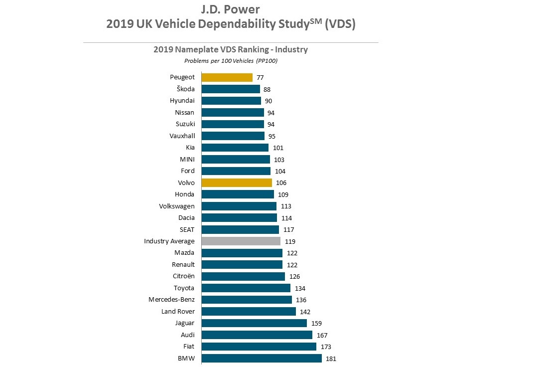 J.D. Power a efectuat un studiu de fiabilitate pentru maşinile din Anglia. Ideea de bază a statisticilor este de a face un top raportat la numărul de probleme apărute în service pentru fiecare 100 de maşini. La studiu au participat 11.530 de proprietari de vehicule nou înregistrate în perioada noiembrie 2015 până în ianuarie 2018. Studiul măsoară problemele cu care s-au confruntat în ultimii 12 luni proprietarii de vehicule din Regatul Unit.