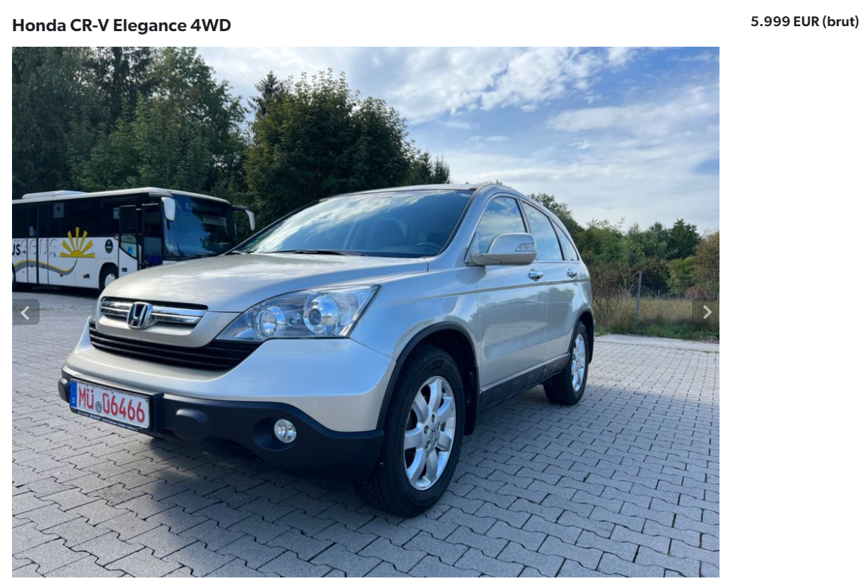 Un alt SUV japonez popular este Honda CR-V. La fel ca Toyota, această Honda folosește un motor de 2,2 litri diesel, dar care produce 140 CP. Mașina are cutie de viteze manuală și tracțiune integrală. Prețul pentru acest exemplar din 2008 cu 162.000 de kilometri la bord este de 5.999 de euro.