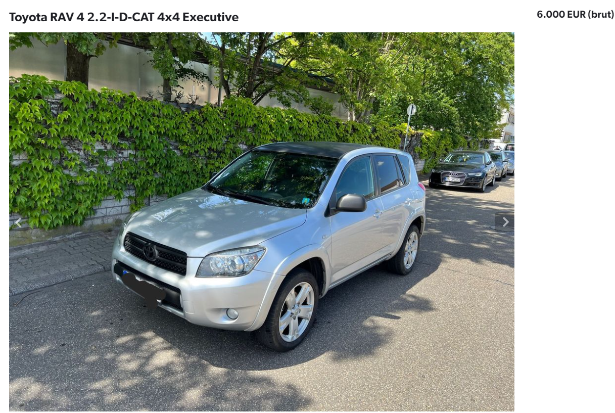 Un alt favorit al publicului este Toyota RAV4. Datorită fiabilității și a aspectelor practice, RAV4 este un model foarte apreciat în toată lumea. Cea pe care noi am ales-o este un model din 2006 cu 178.000 de kilometri la bord. Motorul este unul de 2,2 litri pe motorină, care produce 177 CP. Cutia la care motorul este cuplat este una manuală, iar mașina are și sistem de tracțiune integrală. Chiar dacă nu este cea mai luxoasă mașina, Toyota RAV4 este un SUV fiabil, pentru care nu va trebui să cheltuiești foarte mulți bani. Prețul cu care se vinde această mașină este de 6.000 de euro.