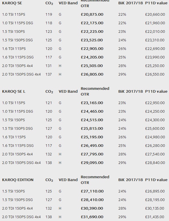 Skoda Karoq în cea mai bună versiune a sa se ridică la 27.110 de lire sterline (30,577 de EURO). Această versiune este dotată cu jante din aliaj de 19 inch, vopsea metalizată, trapă panoramică, afişaj de 9,2 inch, sistem de control prin gesturi, lumină ambientală cu LED-uri, Lane Assist, senzori de dete ctare a punctului mort şi recunoaşterea semnelor de circulaţie.