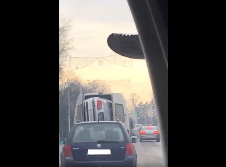 Se întâmplă în România. Mașina, un BMW, a fost răsturnată pe o parte, și transportată așa pe străzile din Rădăuți, județul Suceava.
