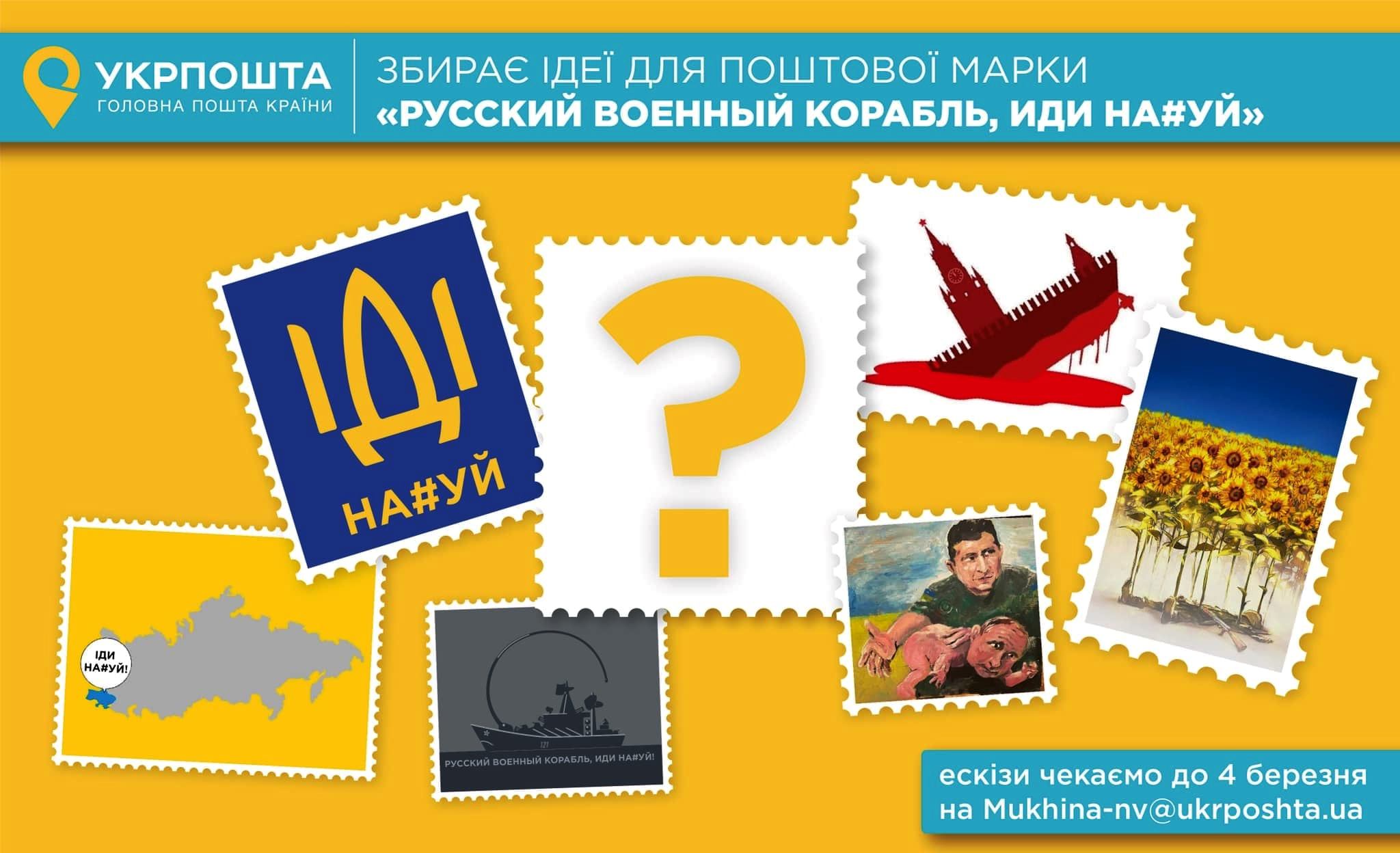 ANPC nu este singura agenție din Ucraina care batjocorește Rusia. Zilele trecute, Poșta Națională a anunțat un „concurs al poporului întreg ucrainean” pentru a găsi cele mai bune modele de ștampile noi. Printre propuneri se numără o ilustrație (foto) în care o navă rusească se scufundă, iar președintele ucrainean Volodimir Zelenskii îl bate la fund pe „bebelul” Putin.