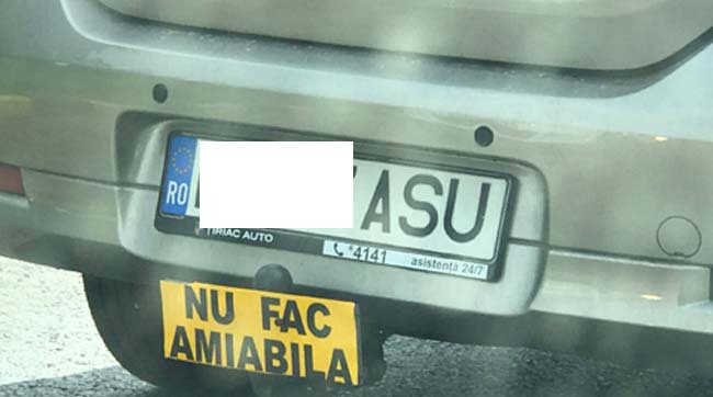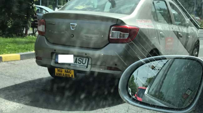 Cabral a surprins în tafic o maşină de şcoală cu nişte numere cel puţin neobişnuite. Trecând peste ASU, prin care vrea să atragă atenţia cum stau lucrurile în privinţa aptitudinilor de condus ale proprietarului, mesajul de sub numărul de înmatriculare informează că şoferul nu este din spus că facă amiabila în cazul unei tamponări.