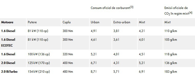 Modelul Astra, Autovehiculul european al anului 2016, este disponibil ca hatchback şi Sports Tourer cu un BiTurbo de 1,6 litri şi putere de 118 kW/160 cp. Motorul cu patru cilindri dezvoltă un cuplu maxim de 350 Nm la numai 1.500 rpm (consum oficial pentru Astra hatchback în conformitate cu NEDC: urban 5,0 l/100 km, extra-urban 3,4 l/100 km, mixt 4,0 l/100 km, emisiile oficiale de CO2 în regim mixt fiind de 106 g/km). Cel mai rapid Astra diesel accelerează de la 0 la 100 km/h în 8,9 secunde şi atinge o viteză maximă de 220 km/h.