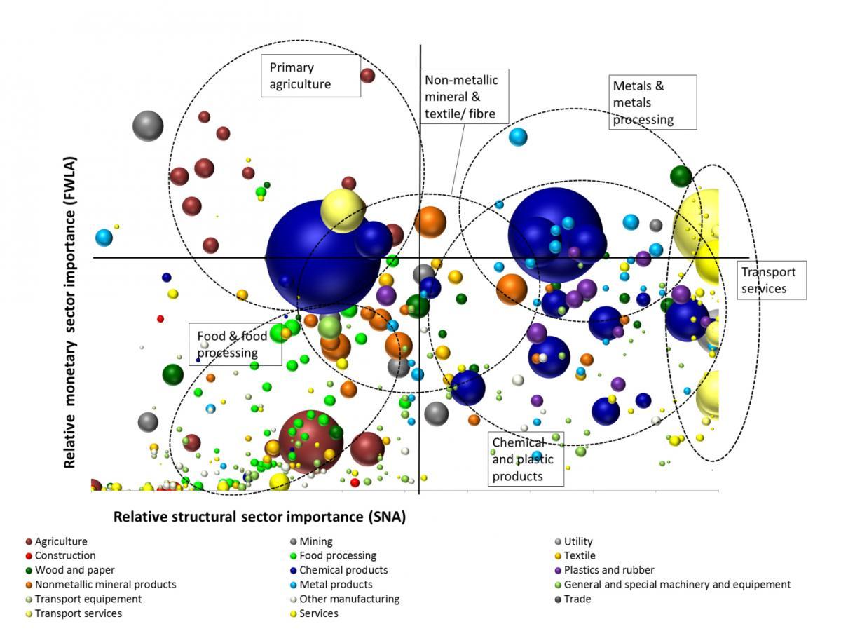 Într-un grafic complex este arătat faptul că transportul personal sau al mărfurilor are nevoie de petrol mai puţin decât sectorul agricol, industria alimentară, prelucrarea metalelor, industria textilă sau domeniul chimic şi de producere a plasticelor. Cu cât ”bulele” din garfic sunt mai mari, cu atât mai mare este vulnerabilitatea acelui sector la creşterea bruscă a preţurilor petrolului.
