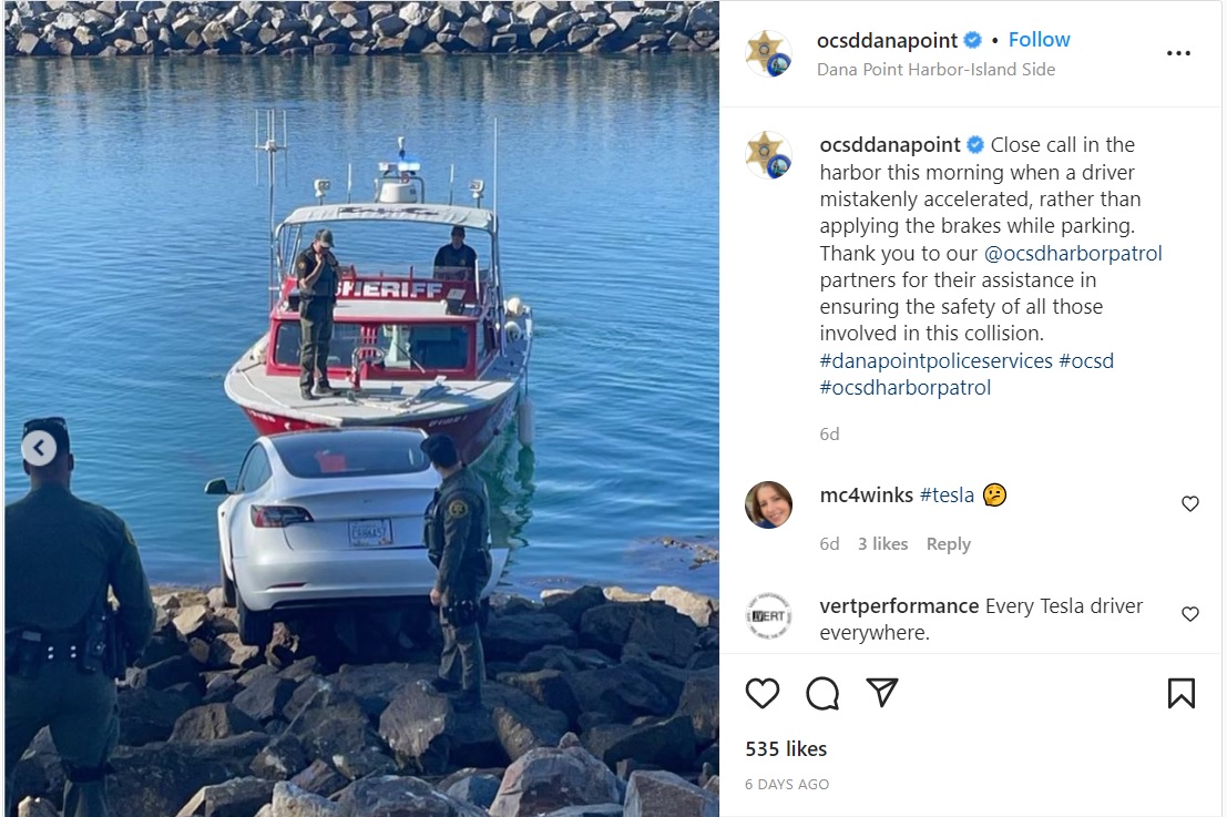 Departamentul de Poliție din Orange County a postat un mesaj pe rețelele de socializare cum că șoferul acelei Tesla Model 3 a accelerat din greșeală în loc să frâneze atunci când a parcat în port.
