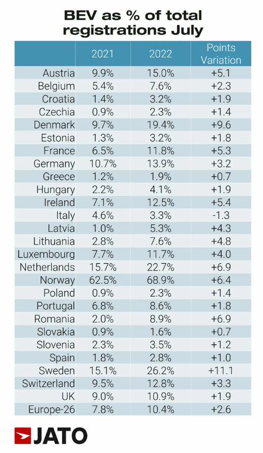 În schimb, înmatriculările de mașini electrice au crescut cu 20%, la 90.139 de unități în iulie. Acest fapt se datorează datorită creșterii ofertelor producătorilor. În Germania, cea mai mare piață pentru astfel de vehicule, cererea a crescut cu 13%. În Franța, a doua cea mai mare piață, cererea a crescut cu 69%.
