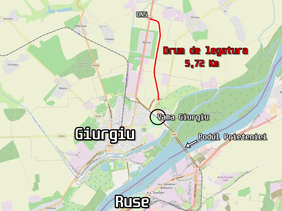 Drumul de legătură DN5 – Vama Giurgiu are o lungime de 5,72 kilometri, constructorul fiind PORR Construct. Valoarea construcției se ridică la 107 milioane lei.