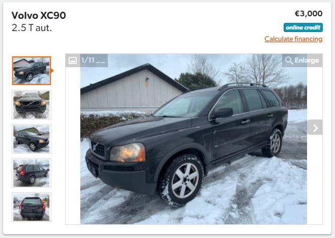 Unul dintre cele mai accesibile exemplare la mâna a doua poate fi cumpărat cu doar 3.000 de euro de pe Mobile.de. Înmatriculat în anul 2004, acest Volvo XC90 indică în prezent un rulaj de 385,000 de km. Este pus în mișcare de un motor pe benzină de 2,521 cm3 care produce 154 kW (209 CP). Dispune de cutie de viteze automată.