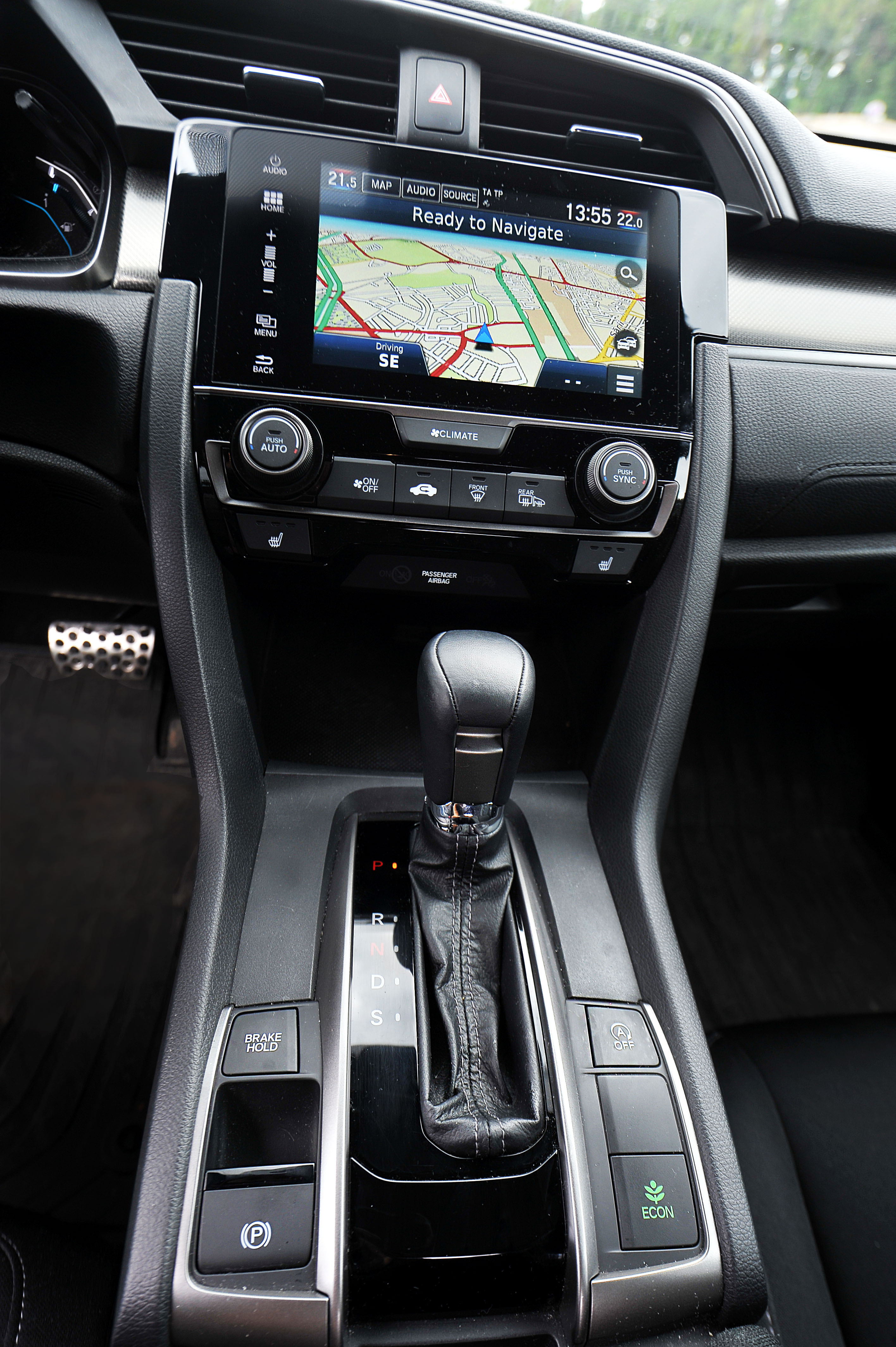 Designul exterior al modelului Honda Civic 5D, cu linii mai puţin cursive, ce pare format din elemente modulare, se transmite şi la interior. Gusturile nu se discută, la fel ca exteriorul, unora li se va părea încărcat, în timp ce alţii vor aprecia viziunea japonezilor. Zona rezervată vitezometrului supradimensionat este complet digitală, în interiorul acestuia fiind afişate informaţiile computerului de bord sau ale sistemelor de asistenţă. Cockipt-ul este împărţit în trei zone, celelalte două nefiind complet digitale, dar având afişaj digital pe cadrane analogice. Singurul reproş poate fi adus butoanelor de pe volan, realizate dintr-un plastic slab calitativ, acesta fiind în notă discordantă cu restul materialelor folosite la interior. Altfel, plasticele folosite sunt bine finisate şi îmbinările sunt de calitate. Consola este de două niveluri, cel inferior găzduind o mufă HDMI şi o mufă USB. Pentru a nu întinde cabluri prin maşină, există un pasaj de trecere. Climalizarea oferă butoane fizice, însă poate fi controlată şi prin intermediul displayului, având chiar un buton care scurtează drumul în meniu.
